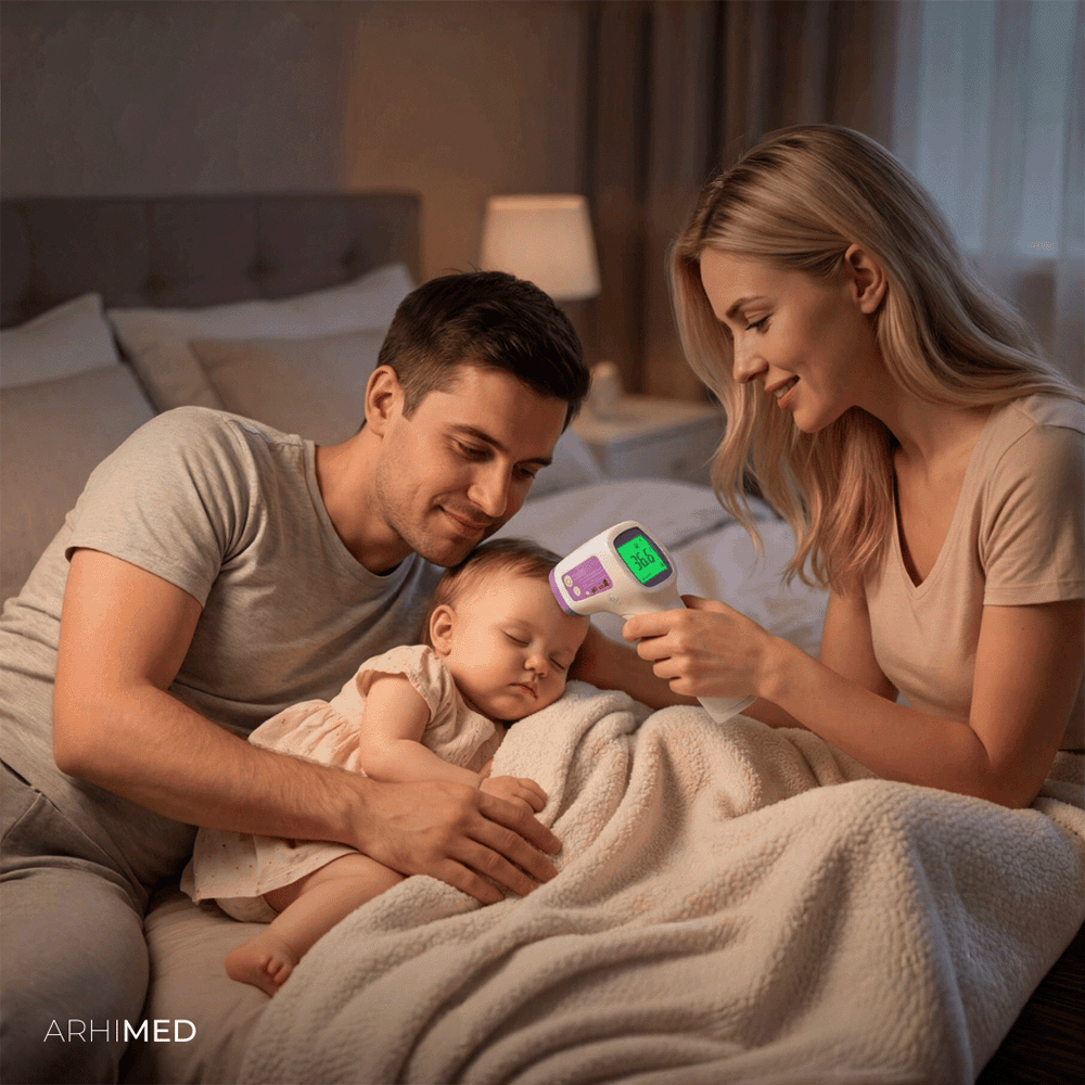 Предлагаем вашему вниманию решение проблемы дискомфортной и длительной процедуры измерения температуры — бесконтактный градусник Архимед Экотерм СТ 350. Он позволит маме хоть каждые 15 минут узнавать температуру ребенка, не тревожа его и не прерывая сон крохи.